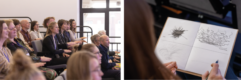 Throughout the day, the participants were engaged in multiple artistic activities—moving and playing instruments with Latvian musician Helēna Kozlova; traveling through human emotions and expressing them in drawings facilitated by Karsten Auerbach from Denmark; and even becoming the source of a poem written by Irish/Danish artist Madeleine Kate McGowan as a reflection of the day. This is yet another example of how culture and art, with the right facilitation, can create a safe and encouraging environment for participants and guide them through the activities, even without any prior knowledge or experience. The artistic engagements encouraged participants to unfold their own creativity and experience a glimpse of how arts and culture can impact and uplift our mental health and well-being.