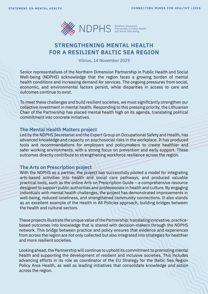 This statement endorsed by the NDPHS Senior Representatives during the Partnership Annual Conference on 14 November 2025 in Vilnius, Lithuania, reaffirms a strengthened regional commitment to advancing mental health through coordinated, cross-sectoral policy action in the Baltic Sea Region. It highlights strategic initiatives that translate political priorities into sustainable cooperation, resilience-building, and long-term impact, including partnership with Ukraine.